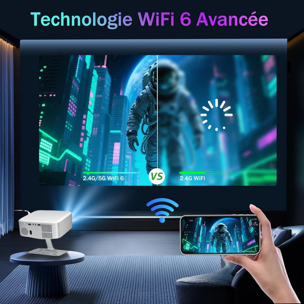 Le Lenoro est un véritable projecteur intelligent : il se connecte à Internet en WiFi ou via un port WAN filaire, offrant une stabilité parfaite pour le streaming 4K, le gaming sur PS5/Xbox, ou les appels vidéo en grand format.