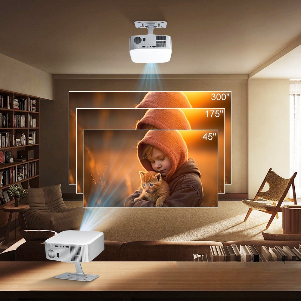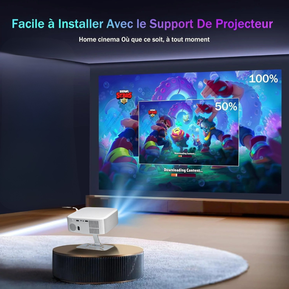 Parce que vous aimez avoir le choix de votre angle de vision, ce projecteur est livré avec un support intégré à inclinaison variable unique. Contrairement aux modèles classiques, il s’incline et pivote librement pour s’adapter à toutes les configurations — mur, plafond, ou même coin de pièce.