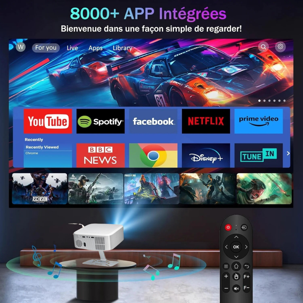 Le projecteur est livré avec Netflix, YouTube et d’autres applications préinstallées, et permet aussi la mise en miroir sans fil de votre smartphone ou tablette.